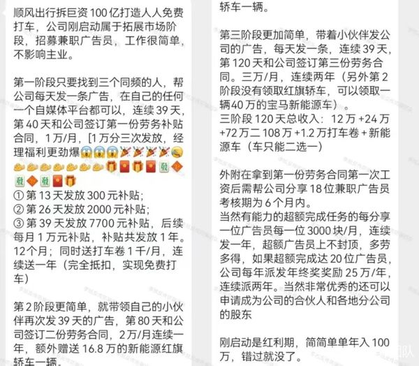 號(hào)稱為“順豐出行”做推廣,要求參與者連續(xù)40天在自媒體平臺(tái)發(fā)廣告,根據(jù)天數(shù)發(fā)放補(bǔ)貼,完成任務(wù)后可獲得1萬元/月補(bǔ)貼。隨后邀請(qǐng)新人共同參與,每發(fā)展一人獎(jiǎng)勵(lì)3千元,完成任務(wù)后,最終補(bǔ)貼將升至3萬元,另有25萬/元的年終獎(jiǎng)。該項(xiàng)目系詐騙,永遠(yuǎn)不可能兌現(xiàn)!