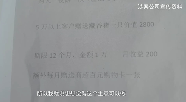 受害人:當時我在菜場買菜,有人來發(fā)傳單說介紹我去養(yǎng)豬,然后給我返利,假如說以后沒有這個返利,豬也還是歸我,我一想覺得這個生意可以做,可以投資,然后我就拿錢去投資了。我還把這個項目介紹給了親戚朋友,我們?nèi)ネ馐⒂^的時候,養(yǎng)殖場確實是存在的,而且規(guī)模也很大,于是我們就放心的把錢投進去了。