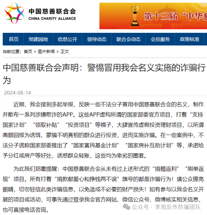 中國(guó)慈善聯(lián)合會(huì)已經(jīng)發(fā)布聲明:警惕冒用我會(huì)名義實(shí)施的詐騙行為