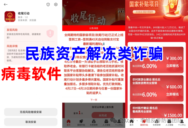 該項(xiàng)目冒充國(guó)家某部門的名義,制作散布涉詐APP,聲稱實(shí)名注冊(cè)即可獲得免費(fèi)領(lǐng)取手機(jī),領(lǐng)取養(yǎng)老金,發(fā)展十個(gè)人可以申請(qǐng)負(fù)債清零,同時(shí)參與“鄉(xiāng)村振興”可獲得國(guó)家補(bǔ)貼。同時(shí)虛構(gòu)推廣“返鄉(xiāng)創(chuàng)業(yè)補(bǔ)貼”“農(nóng)村旅游業(yè)建設(shè)”“農(nóng)村醫(yī)療建設(shè)”“城鄉(xiāng)養(yǎng)老保障”等高額返利理財(cái)項(xiàng)目。