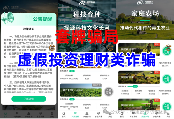 該項(xiàng)目冒充“阿里巴巴數(shù)字農(nóng)業(yè)”的旗號(hào),打著“數(shù)字農(nóng)業(yè)”的名義,制作散布涉詐APP,虛構(gòu)推廣“石農(nóng)086”“冀豆12號(hào)”“冀綠15號(hào)”“家庭農(nóng)場(chǎng)”等高額返利理財(cái)項(xiàng)目。