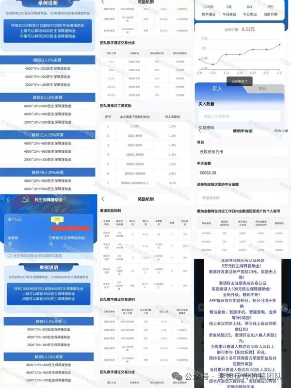 同時,平臺發(fā)行“數(shù)字通證”,用戶可按照每日價格進(jìn)行交易買賣,設(shè)立“初級—資深交易員”5個級別,根據(jù)交易數(shù)量和團(tuán)隊人數(shù)完成晉升,發(fā)放邀請獎勵、團(tuán)隊返傭、直推月工資等多項獎勵。持有更多“通證”并推薦相應(yīng)人數(shù)解鎖更多民生援助金。