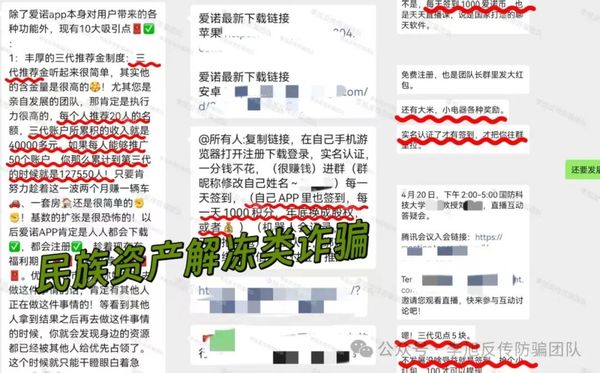 謊稱“國家打造的聊天軟件”,要求用戶實名注冊。隨后拉入群中每日聽課簽到獲得“愛諾幣”,號稱年底可兌換股權(quán)或現(xiàn)金。發(fā)展下線獲得三代見點獎,還有額外大米、小家電等各種獎勵。該APP并非國家項目,傳銷特征明顯,實為詐騙。
