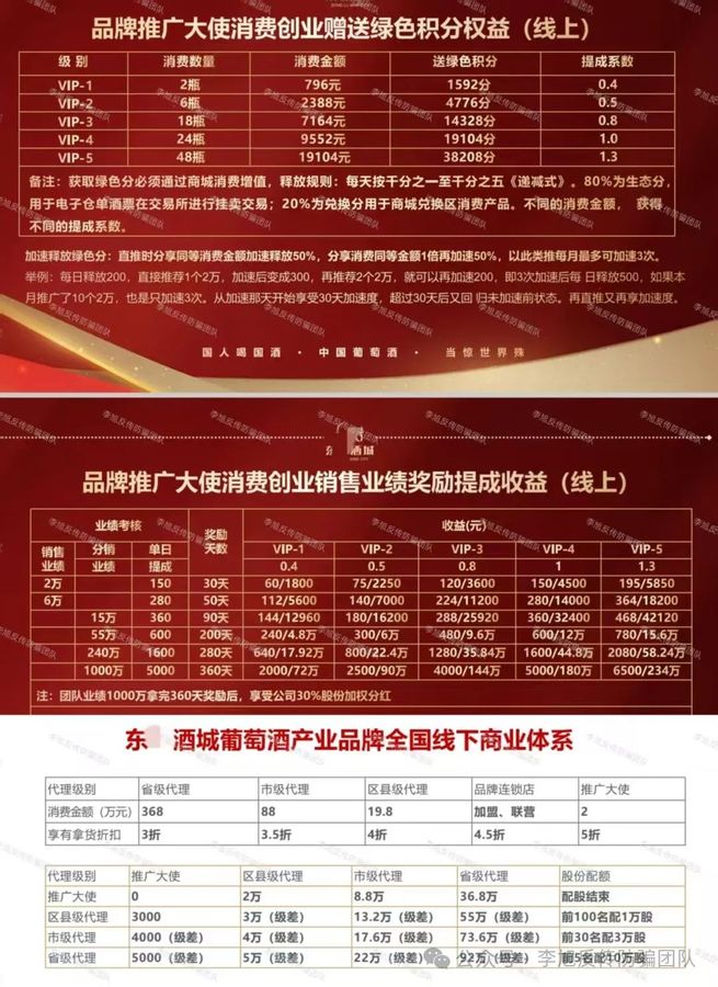 消費者購買葡萄酒可獲2倍綠色積分(80%為可交易的生態(tài)分、20%為兌換分),按每日1-5‰釋放,推廣新人消費可獲提成系數(shù)及加速積分釋放權(quán)益。推廣大使分為5級,根據(jù)消費對應(yīng)不同級別,團(tuán)隊業(yè)績達(dá)標(biāo)可獲日工資獎勵及股份分紅,前1000名優(yōu)秀大使贈送原始股。