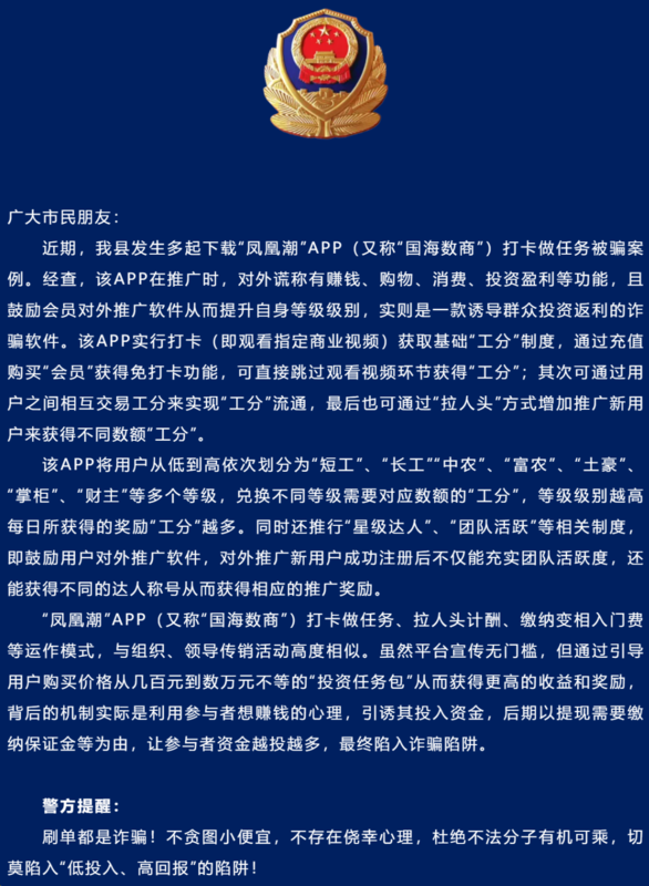 發(fā)表時間:2025-04-22 18:11作者:織金公安來源:織金公安 廣大市民朋友: 近期,我縣發(fā)生多起下載“鳳凰潮”APP(又稱“國海數(shù)商”)打卡做任務被騙案例。經(jīng)查,該APP在推廣時,對外謊稱有賺錢、購物、消費、投資盈利等功能,且鼓勵會員對外推廣軟件從而提升自身等級級別,實則是一款誘導群眾投資返利的詐騙軟件。該APP實行打卡(即觀看指定商業(yè)視頻)獲取基礎“工分”制度,通過充值購買“會員”獲得免打卡功能,可直接跳過觀看視頻環(huán)節(jié)獲得“工分”;其次可通過用戶之間相互交易工分來實現(xiàn)“工分”流通,最后也可通過“拉人頭”方式增加推廣新用戶來獲得不同數(shù)額“工分”。 該APP將用戶從低到高依次劃分為“短工”、“長工”“中農(nóng)”、“富農(nóng)”、“土豪”、“掌柜”、“財主”等多個等級,兌換不同等級需要對應數(shù)額的“工分”,等級級別越高每日所獲得的獎勵“工分”越多。同時還推行“星級達人”、“團隊活躍”等相關制度,即鼓勵用戶對外推廣軟件,對外推廣新用戶成功注冊后不僅能充實團隊活躍度,還能獲得不同的達人稱號從而獲得相應的推廣獎勵。 “鳳凰潮”APP(又稱“國海數(shù)商”)打卡做任務、拉人頭計酬、繳納變相入門費等運作模式,與組織、領導傳銷活動高度相似。雖然平臺宣傳無門檻,但通過引導用戶購買價格從幾百元到數(shù)萬元不等的“投資任務包”從而獲得更高的收益和獎勵,背后的機制實際是利用參與者想賺錢的心理,引誘其投入資金,后期以提現(xiàn)需要繳納保證金等為由,讓參與者資金越投越多,最終陷入詐騙陷阱。 警方提醒: 刷單都是詐騙!不貪圖小便宜,不存在僥幸心理,杜絕不法分子有機可乘,切莫陷入“低投入、高回報”的陷阱! ![]() [此文來源:織金公安,版權說明:以上文字及圖片來源于網(wǎng)絡,僅供學習和交流使用,不具有任何商業(yè)用途,其目的在于傳遞更多的信息,并不代表本平臺贊同其觀點。版權歸原作者所有,如涉版權或來源標注有誤,請及時和我們?nèi)〉寐?lián)系,我們將迅速處理,謝謝!] |