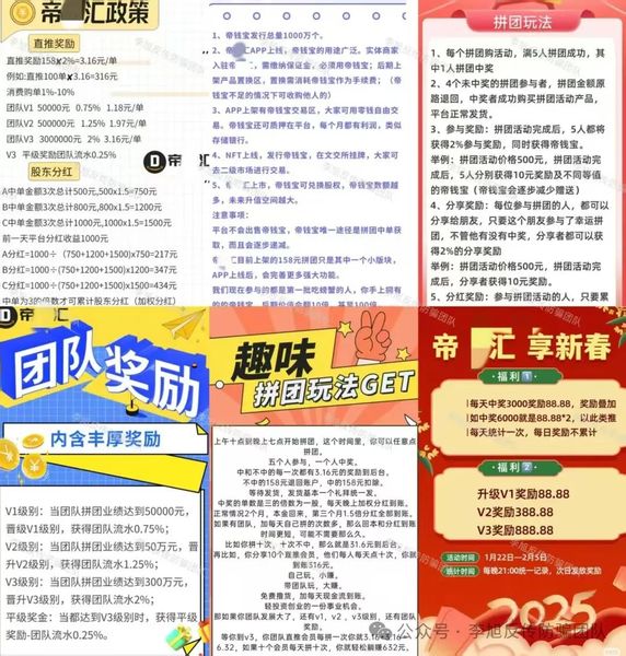 以社交電商為噱頭,采用“5人拼團(tuán),1人中獎(jiǎng)”模式,未中獎(jiǎng)?wù)哔Y金原路退回并獲3.16元獎(jiǎng)勵(lì)及“帝錢寶”,中獎(jiǎng)?wù)邉t扣除費(fèi)用等待發(fā)貨;設(shè)置多樣獎(jiǎng)勵(lì)機(jī)制,每日中獎(jiǎng)金額達(dá)3000元可獲88.88元,升級(jí)V1 - V3分別獎(jiǎng)勵(lì)88.88元、388.88元、888.88元,還有每單3.16元的直推獎(jiǎng)、團(tuán)隊(duì)流水0.75%—2%的業(yè)績(jī)分級(jí)獎(jiǎng)勵(lì)、累計(jì)中獎(jiǎng)3次參與加權(quán)分紅等;推出的“帝錢寶”,宣稱可用于商家入駐繳費(fèi)、平臺(tái)交易、質(zhì)押獲利及未來兌換股權(quán),僅通過拼團(tuán)中獎(jiǎng)獲取且逐步遞減。