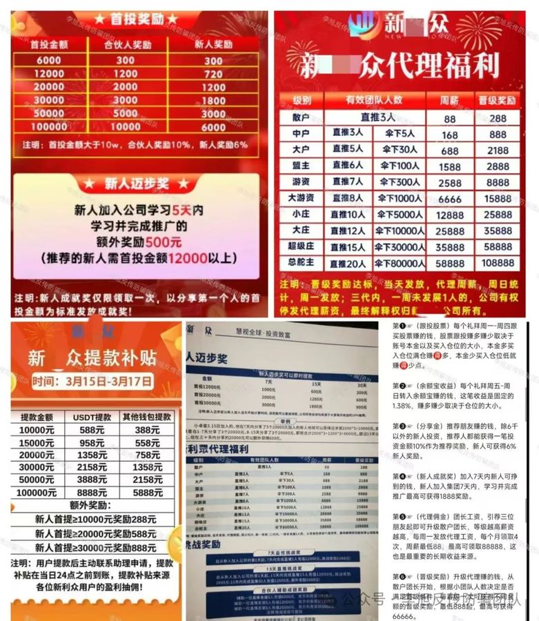 但是,就在李旭反傳防騙團(tuán)隊(duì)收集資料的同時(shí),另一款名為“新某眾”(弈某金融)的股票跟投APP進(jìn)入團(tuán)隊(duì)視野。該平臺(tái)以“每日2%固定收益+1.38%余額寶收益”為誘餌,疊加“分享金”“新人成就獎(jiǎng)”“代理傭金”等多層級(jí)獎(jiǎng)勵(lì)機(jī)制,鼓勵(lì)用戶拉攏下線。