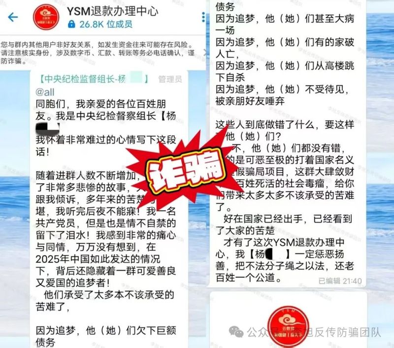 不法分子冒充國(guó)家公職人員,謊稱為多年追夢(mèng)人辦理退款吸引大眾,以達(dá)到詐騙目的。小編提示,該項(xiàng)目為“云數(shù)貿(mào)”系列詐騙,“楊某某”身份系偽造,切莫相信!
