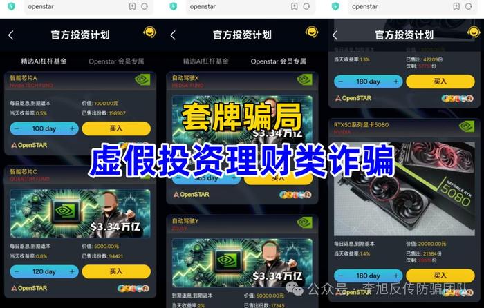 該項(xiàng)目冒充“英偉達(dá)”公司的旗號,不法分子制作散布涉詐APP,虛構(gòu)推廣“智能芯片A”“自動駕駛X”“RTX50系列顯卡5080”等每日返息、到期返本高額返利理財(cái)項(xiàng)目。