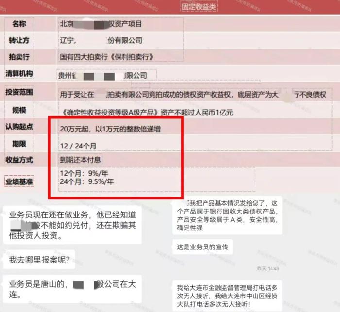 網(wǎng)友舉報,該項目宣稱為“銀行固收大類債券”產(chǎn)品,年收益9%左右,到期還本付息。但目前已到兌付之日,項目方卻以“資金周轉(zhuǎn)不善”無限拖延兌付期限。而業(yè)務(wù)員在明知無法如約兌付的情況下,還在不停拉人投資。
