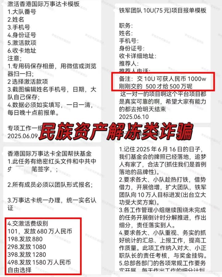 多名網(wǎng)友舉報,該項目自稱有擁有“絕密紅頭文件”,要求參與者繳納101—498元辦理萬事達(dá)卡,可領(lǐng)取680萬—1580萬元。另開設(shè)“鐵軍團(tuán)隊”項目,繳納10U(75元)報單,可獲得1000萬人民幣。