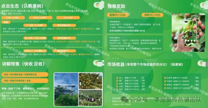 該認(rèn)養(yǎng)果樹模式本質(zhì)是用戶投入資金,平臺承諾每日0.8%—1%固定比例收益,直至本金3倍,符合“承諾還本付息”特征,涉嫌非法集資。繳納1980元屬變相入門費(fèi),收益主要來自發(fā)展下線,而非真實農(nóng)業(yè)經(jīng)營,符合傳銷特征。