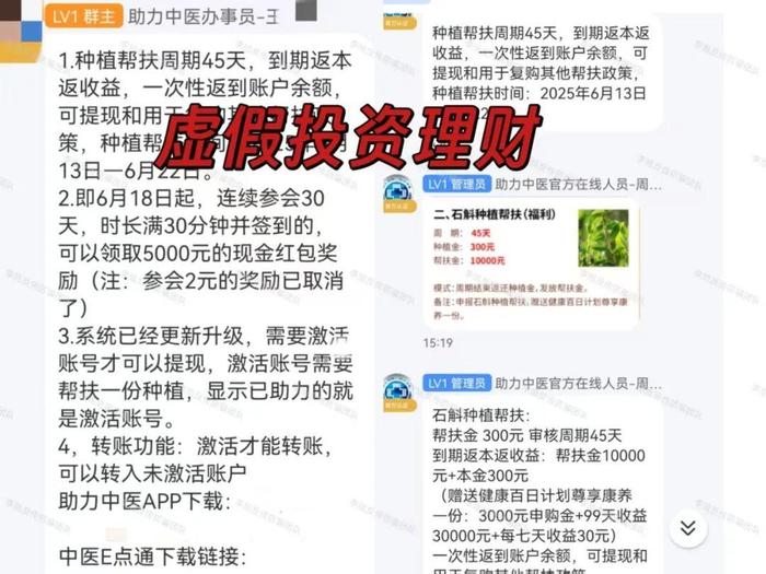 最初是以“助力中醫(yī)”為噱頭,號稱為參與者發(fā)放25萬“中醫(yī)藥振興發(fā)展基金”吸引大眾,隨后利用各類股票、補(bǔ)貼、獎金大肆發(fā)展團(tuán)隊。近日,項目方開始逐漸露出本來面目,要求參與者認(rèn)購一份“種植幫扶”理財產(chǎn)品激活賬號作為提現(xiàn)條件。