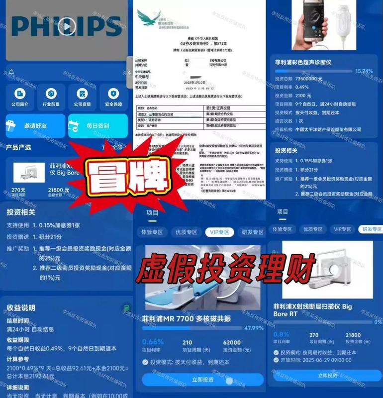 冒充“PHILIPS飛利浦”名義,推出虛假投資理財項目,每日收益到期返本。推薦新人投資享一級2%、二級1%收益。同時發(fā)行FSP期貨債券,以高額收益吸引參與者認(rèn)購?fù)顿Y。