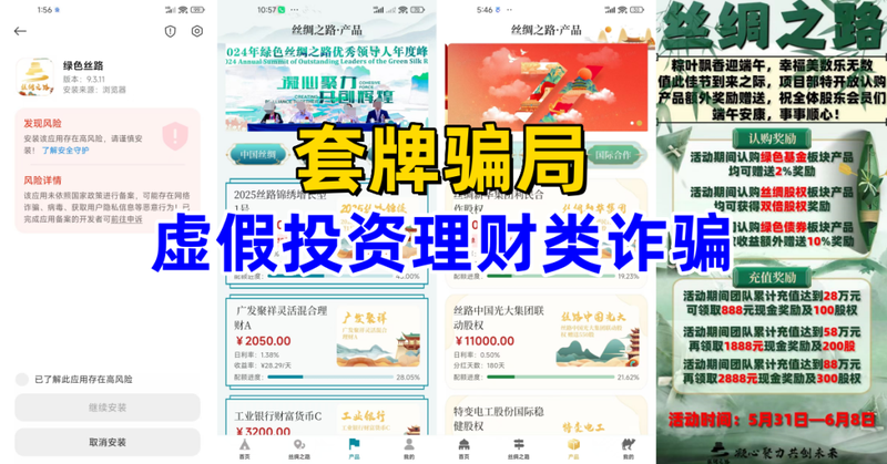 發(fā)表時(shí)間:2025-06-22 18:58作者:李旭反傳銷來源:李旭反傳防騙團(tuán)隊(duì) 高收益意味著高風(fēng)險(xiǎn),收益率超過6%就要打問號,超過8%就很危險(xiǎn),10%以上就要準(zhǔn)備損失全部本金?!袊嗣胥y行黨委書記、中國銀保監(jiān)會(huì)主席郭樹 ![]() 一:投資理財(cái)涉嫌非法集資、傳銷、詐騙 1、套牌的“絲綢之路SCZL”APP 不法分子冒充“絲綢之路辦公室”的名義,打著“一帶一路”的旗號,制作散布涉詐APP,虛構(gòu)推廣“2025絲路錦繡增長型1號”“廣發(fā)聚祥靈活混合理財(cái)A”“絲綢新華集團(tuán)利民合作股權(quán)”“絲路中國光大集團(tuán)聯(lián)動(dòng)股權(quán)”等高額返利項(xiàng)目。 ![]() 據(jù)網(wǎng)友反饋,該項(xiàng)目修改了好幾次名稱,下載該應(yīng)用只能通過第三方鏈接、二維碼下載,下載提示未備案,可能存在網(wǎng)絡(luò)詐騙、病毒、獲取用戶隱私信息等惡意行為,收款賬戶為第三方個(gè)人、公司,涉嫌詐騙。 2、套牌的“卡貝”APP 網(wǎng)友反饋,有朋友給他推薦了一個(gè)投資理財(cái)項(xiàng)目,該項(xiàng)目自稱:通過集中散戶(大家)的資金力量精選個(gè)股進(jìn)行短線操作,以專業(yè)團(tuán)隊(duì)操盤和以大體量資金為支撐的前提下進(jìn)行超短線交易。 參與者只需要繳納費(fèi)用,點(diǎn)跟投,股票由專家統(tǒng)一購買,即可穩(wěn)賺不賠。 ![]() 據(jù)網(wǎng)友反饋,該應(yīng)用只能提供第三方鏈接下載,下載提示未備案,帶病毒,收取款賬戶為第三方個(gè)人,涉嫌詐騙。 案例: 一張嘴,一份PPT,“聯(lián)眾投”何以籠絡(luò)人心?維權(quán)也要當(dāng)心陷阱! ![]() 3、“AK王牌理財(cái)”拆分理財(cái)網(wǎng)絡(luò)傳銷 據(jù)網(wǎng)友反饋這個(gè)項(xiàng)目是AS改名而來,聲稱投資電子股票,可獲得靜態(tài)收益、發(fā)展下線可獲得動(dòng)態(tài)收益,涉嫌傳銷、非法集資、詐騙。 案例:羅源法院公開宣判一起涉案金額達(dá)60億元的組織、領(lǐng)導(dǎo)傳銷活動(dòng)案 ![]() 4、套牌的“綠地香港”APP 不法分子冒充“綠地香港”公司的名義,制作散布涉詐APP,虛構(gòu)推廣“中國夢專項(xiàng)社會(huì)保障金”“社會(huì)基礎(chǔ)民生保證股權(quán)”“銀齡悅享專項(xiàng)債券”等高額返利項(xiàng)目。 ![]() 據(jù)網(wǎng)友反饋,參與該項(xiàng)目只能通過第三方鏈接、二維碼、安裝包下載,下載提示,未備案,收款賬戶每次都是不同的個(gè)人賬戶,同時(shí)采用傳銷模式發(fā)展下線,涉嫌傳銷、詐騙。 二:民族資產(chǎn)解凍類詐騙 1、“中國紅413”掃描簽到項(xiàng)目 該項(xiàng)目打著“國家項(xiàng)目”的旗號,要求參與者提供個(gè)人信息,每天簽到學(xué)習(xí),掃各種二維碼看視頻、下載APP,不定期要求參與者在某商城固定商戶購買物品,聲稱可獲得幾百萬的回報(bào)。 ![]() 據(jù)網(wǎng)友反饋,該項(xiàng)目是從“寶成團(tuán)隊(duì)”分裂出來,這是民族資產(chǎn)解凍類詐騙。 2、套牌的“慈善聯(lián)盟”APP 不法分子冒充“中國慈善聯(lián)合會(huì)”的名義,制作散步涉詐APP,虛構(gòu)推廣高額返利理財(cái)項(xiàng)目實(shí)施詐騙。 去年8月14日,中國慈善聯(lián)合會(huì)官方網(wǎng)站發(fā)布聲明:警惕冒用我會(huì)名義實(shí)施的詐騙行為 ![]() 3、虛構(gòu)的“幸福中國”APP 4、套牌的“民生-三農(nóng) ”APP 不法分子冒充“中國三農(nóng)”公司的名義,打著“智慧農(nóng)業(yè)”“數(shù)字農(nóng)業(yè)”的旗號,制作散布涉詐APP,虛構(gòu)推廣“四野牧業(yè)”“山川生物科技”“華英農(nóng)業(yè)”等高額返利理財(cái)項(xiàng)目。 ![]() 據(jù)網(wǎng)友反饋,該應(yīng)用只能通過第三方鏈接下載,下載提示未備案,同時(shí)采用傳銷模式發(fā)展下線,收款賬戶為第三方個(gè)人,涉嫌傳銷、詐騙。 今年4月份信息通信行業(yè)反詐中心發(fā)文《【涉詐高風(fēng)險(xiǎn)APP曝光臺】“政府項(xiàng)目”?謹(jǐn)防詐騙!(四)》文中提到,“中國三農(nóng)”APP就是詐騙。 ![]() 5、虛構(gòu)的“華夏社區(qū)”APP 6、虛構(gòu)的“民生扶貧”APP 三:異地聚集式傳銷 1、甘肅金昌/寧夏靈武“西部大開發(fā)”33500傳銷 模式:該傳銷組織打著“國家項(xiàng)目”“西部大開發(fā)”“中國夢”等旗號,以旅游、介紹工作、網(wǎng)戀交友等方式將人騙至金昌進(jìn)行洗腦,鼓吹投資33500元,出局可獲得300萬-500萬元的回報(bào)。 ![]() 2、山西大同“財(cái)富聯(lián)盟”13199傳銷 模式:該傳銷組織打著“財(cái)富聯(lián)盟”的旗號,鼓吹投資13199元加入,發(fā)展下線,出局可獲得300萬的回報(bào)。 ![]() 3、成都/合肥/貴陽“連鎖經(jīng)營”69800傳銷 模式:該傳銷組織打著“資本運(yùn)作”“連鎖經(jīng)營”“國家項(xiàng)目”等旗號,以介紹工作、網(wǎng)戀交友、旅游等名義將人騙至傳銷地進(jìn)行洗腦,鼓吹投資一份3800元至二十一份69800元加入該組織,出局可以獲得1040萬元的回報(bào)。 [此文來源:李旭反傳防騙團(tuán)隊(duì),版權(quán)說明:以上文字及圖片來源于網(wǎng)絡(luò),僅供學(xué)習(xí)和交流使用,不具有任何商業(yè)用途,其目的在于傳遞更多的信息,并不代表本平臺贊同其觀點(diǎn)。版權(quán)歸原作者所有,如涉版權(quán)或來源標(biāo)注有誤,請及時(shí)和我們?nèi)〉寐?lián)系,