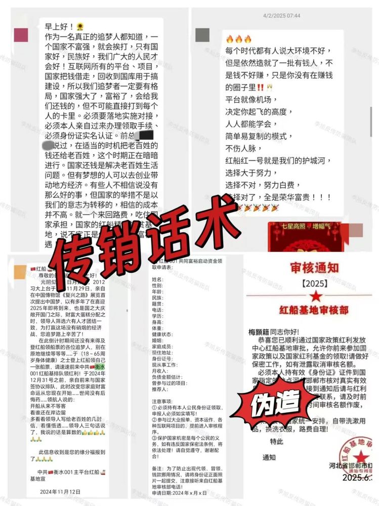 徐女士回到家中后,推薦人和組織者每天都鼓動(dòng)她繼續(xù)投入資金。她感到非常迷茫,不知道該如何抉擇。她意識(shí)到這個(gè)平臺(tái)可能存在問題,但又無法完全確定。組織話術(shù)漏洞百出,卻刻意包裝“神秘感”:稱“秦皇島項(xiàng)目是國(guó)家篩選堅(jiān)定者的試驗(yàn)”,“地下活動(dòng)是為迷惑外國(guó)勢(shì)力”,而衡水的平臺(tái)才是“真正的001號(hào)平臺(tái)”。徐女士發(fā)現(xiàn),所謂“國(guó)庫黃金實(shí)驗(yàn)”不過是用黃金首飾的張力演示“水不溢出”,而推薦人每日群發(fā)的“紅船通知”,字里行間都在催促“2025年前簽協(xié)議,錯(cuò)過再無機(jī)會(huì)”。