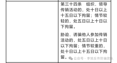 第三十四條 組織、領(lǐng)導(dǎo)傳銷活動(dòng)的,處十日以上十五日以下拘留;情節(jié)較輕的,處五日以上十日以下拘留。