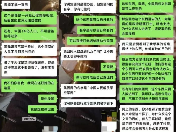 楊先生的女友被親姐姐帶入傳銷,即便看到警察搗毀窩點(diǎn),仍堅(jiān)信“1040是合法項(xiàng)目”,楊先生給她看了網(wǎng)上法院的判決書、出局證是假的,以及手機(jī)集團(tuán)網(wǎng)不需要工信部審批就可辦理等,她依舊執(zhí)迷不悟,認(rèn)為是“宏觀調(diào)控”,堅(jiān)信“中國人民解放軍空軍網(wǎng)”這個(gè)集團(tuán)網(wǎng)名字就是“國家支持”的佐證。甚至要求楊先生“聽完再評(píng)判”,否則便斷絕聯(lián)系。他聯(lián)系家人勸說無果,只能在絕望中堅(jiān)持。