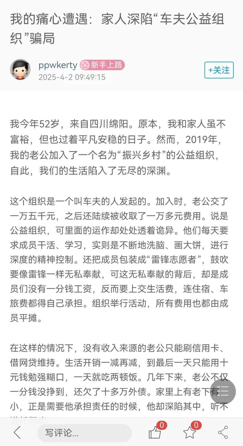 血淚控訴:數(shù)十萬家庭被掏空,眾多受害者家庭經(jīng)濟(jì)崩潰,負(fù)債累累,此前我們發(fā)文曝光過,綿陽一家庭因丈夫加入“振興鄉(xiāng)村”組織,借款十多萬元,全家每日生活費(fèi)僅10元,一天兩餐度日 。
