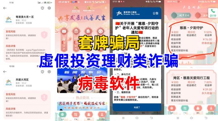 不法分子冒充“粵港澳大灣區(qū)門戶網(wǎng)”的名義,制作散布涉詐“粵港澳大灣區(qū)”APP,虛構(gòu)推廣“肇慶高要產(chǎn)業(yè)園”“惠州仲愷產(chǎn)業(yè)園”“佛山大塘產(chǎn)業(yè)園”“廣肇高速”“灣區(qū)·慈恩關(guān)愛同行工程”等周收益高達5%以上返利理財項目。