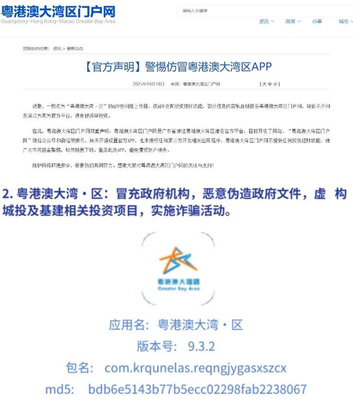 4月16日、18日,粵港澳大灣區(qū)門戶網(wǎng)與信息通信行業(yè)反詐中心發(fā)文,提示廣大網(wǎng)友,“粵港澳大灣區(qū)”APP是詐騙軟件。