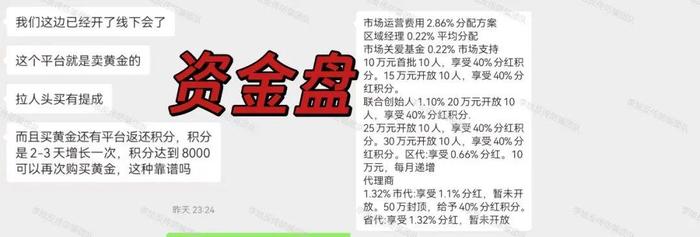 正常黃金投資是賺“價(jià)格波動(dòng)”或“實(shí)物保值”,但這里的黃金只是“入門憑證”,和黃金本身的市場(chǎng)屬性無(wú)關(guān)。若真要投資黃金,一定要去銀行或正規(guī)金店,避免陷入資金盤。