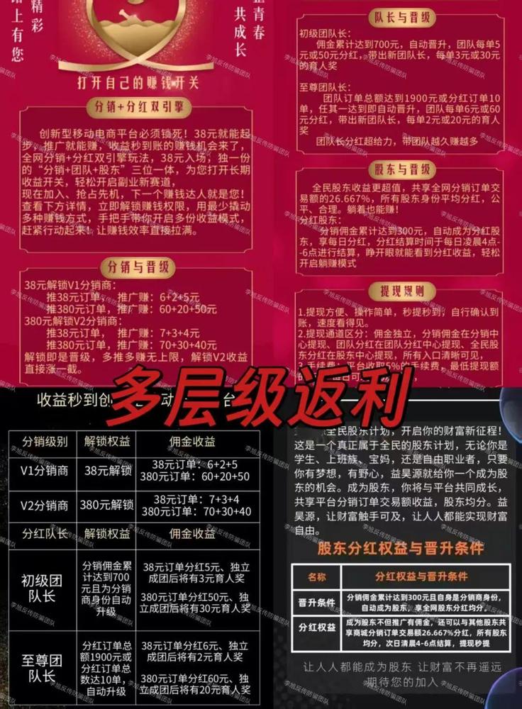 發(fā)表時(shí)間:2025-08-01 10:31作者:李旭反傳銷(xiāo)來(lái)源:李旭反傳防騙團(tuán)隊(duì) “知名企業(yè)合伙”、“國(guó)家項(xiàng)目”、“人工智能”、“跨境電商”…… 騙子現(xiàn)在越來(lái)越懂得如何為項(xiàng)目鍍金,他們太清楚人們對(duì)權(quán)威的盲目信任,對(duì)“高大上”概念的本能敬畏足以讓大家心甘情愿掏腰包,但是,所有違背市場(chǎng)規(guī)律的暴富神話(huà),其實(shí)都是鐮刀出鞘的前奏。 盜用巨頭名號(hào)、虛構(gòu)政府背景、套用前沿科技詞匯……這些套路早就被騙子“信手拈來(lái)”,千萬(wàn)別被“動(dòng)態(tài)收益”沖昏頭腦,別用“人脈”為騙局背書(shū),更別讓“沉沒(méi)成本”綁架理智,遇到可疑項(xiàng)目,立刻拉黑、止損、舉報(bào),才是對(duì)自己和家人負(fù)責(zé)的態(tài)度,雪崩時(shí)沒(méi)有一片雪花是無(wú)辜的,千萬(wàn)別讓你的貪心為騙子沖“業(yè)績(jī)”。 網(wǎng)絡(luò)傳銷(xiāo)詐騙 01、益某源電商 以“分銷(xiāo)+分紅”為幌子,用戶(hù)繳納38元解鎖V1分銷(xiāo)、380元解鎖V2分銷(xiāo),通過(guò)“V1、V2、團(tuán)隊(duì)長(zhǎng)、股東”等多個(gè)層級(jí)強(qiáng)制用戶(hù)花錢(qián)購(gòu)買(mǎi)“資格”,形成多層級(jí)付費(fèi)體系;推廣相應(yīng)金額訂單,根據(jù)級(jí)別獲得拉人返傭和團(tuán)隊(duì)訂單分紅。另設(shè)“育人獎(jiǎng)”激勵(lì)用戶(hù)發(fā)展下線(xiàn)。 ![]() 目前,該項(xiàng)目已多日停止發(fā)放分紅,并將群聊解散,疑似崩盤(pán)。 ![]() 02、薪某優(yōu)選 謊稱(chēng)“騰訊”合作項(xiàng)目,利用視頻號(hào)帶貨行傳銷(xiāo)之實(shí)。 要求用戶(hù)繳納100元保證金開(kāi)通“帶貨助手”,隨后消費(fèi)12單約500元,以“電商創(chuàng)業(yè)”為包裝,強(qiáng)制設(shè)置資金門(mén)檻,屬變相入門(mén)費(fèi)。 ![]() 隨后招募3名下線(xiàn),通過(guò) “三三裂變”“分店拓展” 形成多層級(jí)團(tuán)隊(duì),收益直接與下級(jí)人數(shù)、訂單量綁定,符合拉人頭、團(tuán)隊(duì)計(jì)酬的傳銷(xiāo)特征。 一個(gè)項(xiàng)目把“拉人頭”“層級(jí)返利”當(dāng)核心,而非商品或服務(wù)本身,其模式完全符合傳銷(xiāo)特征。 ![]() 虛假投資理財(cái) 01、SFL海洋能源 平臺(tái)發(fā)布“WaveSub潮汐能轉(zhuǎn)換器”、“Pelamis 波浪能轉(zhuǎn)換器”等多款虛假投資理財(cái)項(xiàng)目,日利率可達(dá)1.28%以上,18天總利率超過(guò)23%,遠(yuǎn)超市場(chǎng)正常投資水平。用戶(hù)通過(guò)鏈上充值進(jìn)行投資,對(duì)方收款賬號(hào)為不同的第三方個(gè)人或公司。 ![]() 自6月份起,便有參與者發(fā)現(xiàn)平臺(tái)推出的產(chǎn)品周期越來(lái)越短,但利率卻越來(lái)越高,最低購(gòu)買(mǎi)分?jǐn)?shù)也在逐步提高,部分參與者開(kāi)始無(wú)法提現(xiàn),疑似平臺(tái)已經(jīng)逐步進(jìn)行單割。隨后平臺(tái)要求用戶(hù)繳納10%質(zhì)押金完成提現(xiàn)。但7月4日,平臺(tái)徹底無(wú)法提現(xiàn),16日服務(wù)器全部關(guān)閉,線(xiàn)下辦事處人去樓空。部分參與者發(fā)覺(jué)被騙聯(lián)合報(bào)案,但至今還未有結(jié)果。 ![]() 02、套牌的“鴻蒙支付”APP 一直處于無(wú)法提現(xiàn)狀態(tài),忽悠參與者繳納380元購(gòu)買(mǎi)股權(quán)解鎖提現(xiàn)資格。但用戶(hù)認(rèn)購(gòu)股權(quán)后仍顯示提現(xiàn)成功,但資金依舊處于審核狀態(tài),遲遲無(wú)法到賬。 ![]() 資金盤(pán) 01、掌中寶 以“看廣告賺收益”為幌子,虛構(gòu)與知名電商合作,設(shè)置“青銅”等付費(fèi)會(huì)員專(zhuān)區(qū),承諾“5000元日賺150元”等高額回報(bào),通過(guò)15%-2%的三級(jí)邀請(qǐng)獎(jiǎng)勵(lì)機(jī)制發(fā)展下線(xiàn)。 7月29日,平臺(tái)發(fā)布公告,謊稱(chēng)遭受不法分子惡意攻擊,關(guān)閉提現(xiàn)通道。并以“賬戶(hù)認(rèn)證”為名,要求參與者認(rèn)購(gòu)專(zhuān)區(qū)金額回復(fù)提現(xiàn)權(quán)限。隨后,該項(xiàng)目徹底卷款跑路,存活周期僅29天。 ![]() 02、優(yōu)某某跨境電商平臺(tái) 以“AI跨境電商”為噱頭,先以無(wú)入門(mén)費(fèi)的“C類(lèi)輕創(chuàng)業(yè)店鋪”為誘餌引流,再推B類(lèi)店鋪強(qiáng)制收取“開(kāi)店聯(lián)盟金”,等級(jí)越高“日利潤(rùn)”“開(kāi)店紅包”越豐厚;同時(shí)設(shè)置1 - 8星工會(huì)體系,要求累計(jì)投入最高達(dá)1500萬(wàn)美元,星級(jí)直接綁定“銷(xiāo)售額分成比例”。還通過(guò)“培育獎(jiǎng)勵(lì)”、“董事分紅”和“晉升強(qiáng)制下線(xiàn)”,形成金字塔式拉人頭模式。同時(shí)發(fā)行“優(yōu)豆”虛擬貨幣,承諾“穩(wěn)賺30%+”。 該模式無(wú)真實(shí)盈利支撐,完全依賴(lài)新入資金續(xù)命,一旦崩盤(pán)投入資金血本無(wú)歸,望警惕! ![]() 03、國(guó)某民富 6月剛剛上線(xiàn)。用戶(hù)認(rèn)購(gòu)3980—19800元不等金額的產(chǎn)品,獲得對(duì)應(yīng)“綠色積分”和“權(quán)益積分”。其中,綠色積分按投資檔位每日按不同比例釋放,80%可提現(xiàn)或兌換“商票”。 動(dòng)態(tài)設(shè)立銷(xiāo)售獎(jiǎng)勵(lì)和職級(jí)獎(jiǎng)勵(lì),劃分9個(gè)VIP等級(jí),按團(tuán)隊(duì)業(yè)績(jī)發(fā)放管理獎(jiǎng)、培育獎(jiǎng)、加權(quán)