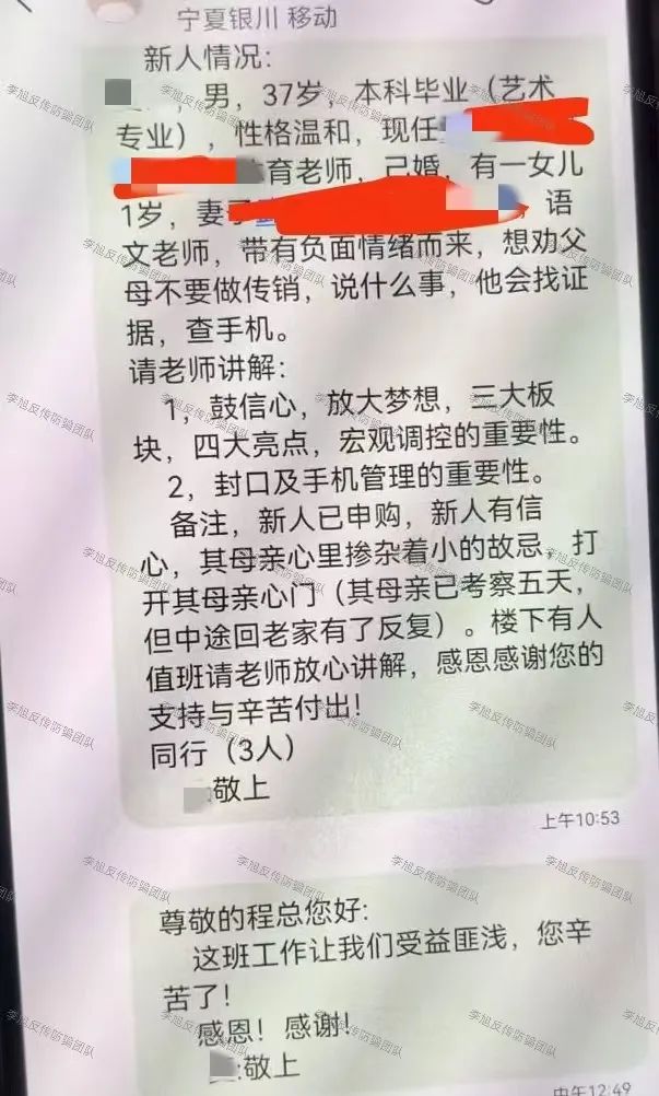 發(fā)表時間:2025-08-14 18:02作者:李旭反傳銷來源:李旭反傳防騙團(tuán)隊 "當(dāng)60歲老人抵押房產(chǎn)換來的40萬投資款,被傳銷團(tuán)伙以'手續(xù)費'名義扣走10萬;當(dāng)新疆退休女性被'月薪2萬'承諾騙至寧夏,經(jīng)歷七天洗腦后欠下10萬債務(wù)——寧夏銀川、靈武、賀蘭等地近年涌現(xiàn)的新型傳銷,正以'西部大開發(fā)''一帶一路'等國家戰(zhàn)略為幌子,專盯中老年群體實施精準(zhǔn)詐騙。"受害者多為50至60歲左右的中老年人,他們辨別能力相對不足,容易被“高額回報”的虛假承諾所誘惑。以下將結(jié)合幾位受害者親身經(jīng)歷,梳理傳銷組織的欺騙過程。 王先生家人:深陷“西部大開發(fā)”騙局,房產(chǎn)抵押后債務(wù)纏身 王先生的家人被銀川靈武一帶的高利貸團(tuán)伙所騙,該團(tuán)伙以“西部大開發(fā)”國家項目為幌子,實則進(jìn)行傳銷活動。在對方的誘惑與強迫下,家人簽訂了房產(chǎn)抵押合同,抵押房產(chǎn)后獲得50萬元,然而高利貸團(tuán)伙以收取費用為由拿走10萬元,實際到手僅40萬。之后,家人還在當(dāng)?shù)鼗ㄙM7000元租下一套三室一廳。 詐騙團(tuán)伙進(jìn)一步誘惑,稱“投入3萬多元支持國家項目,就能獲得高額回報”,已60歲且無還款能力的家人再次上鉤。7月9日,家人帶著高利貸人員來到王先生家,兩人一唱一和并試圖開門(過程被錄音)。王先生因受到驚嚇,于7月10日被迫簽署協(xié)議。 7月26日,得知虧損后,王先生和朋友陪同家人前往警局報案,但因?qū)Ψ骄懿怀姓J(rèn),事情不了了之。咨詢寧波的法律機構(gòu)后,得知需找到相關(guān)合同,可回家后查看檔案袋,里面根本沒有合同。7月29日,王先生得知家人投入的錢只剩8萬,勸說其停止參與并追問合同下落,家人稱合同在檔案袋里,可事實并非如此,雙方為此發(fā)生激烈爭吵。爭吵中,王先生錄音聽到傳銷團(tuán)伙在本地有“一萬元貸款月利息五千元”的高利貸行為,還想讓家人帶他加入,甚至謊稱有某局長的電話,家人對此深信不疑。目前,該傳銷團(tuán)伙為家人創(chuàng)建的“工作號”中已有22人,而家人不顧勸說,再次前往銀川,并帶走了三個朋友一起考察。值得注意的是,這并非家人首次被騙,此前曾被“永倍達(dá)”騙局坑害,他人的勸說也毫無作用。 左先生:被“戀愛”誘騙入傳銷,識破騙局后憤怒離開 左先生通過聊天軟件認(rèn)識一名女子,對方自稱在內(nèi)蒙古鄂爾多斯做牛羊肉外貿(mào),利潤豐厚。以談戀愛為名與左先生聊天一個月后,女子誘騙他前往鄂爾多斯旅游。 抵達(dá)后,女子帶左先生游玩當(dāng)?shù)鼐包c,同時進(jìn)行洗腦,以國家發(fā)展特區(qū)、西部大開發(fā)等名義宣揚當(dāng)?shù)匕l(fā)展前景,暗示有賺錢機會。第二天,女子帶他去聽課,要求交納33500元投資,左先生此時意識到這是傳銷。傳銷組織將當(dāng)?shù)鼐包c、建筑等與傳銷理念關(guān)聯(lián),進(jìn)行虛假宣傳,還把國家政策、領(lǐng)導(dǎo)人與傳銷項目聯(lián)系起來,偽造官方背景,宣揚移民、發(fā)錢等虛假政策,利用受害者貪圖利益的心理承諾高額回報。