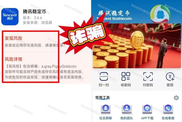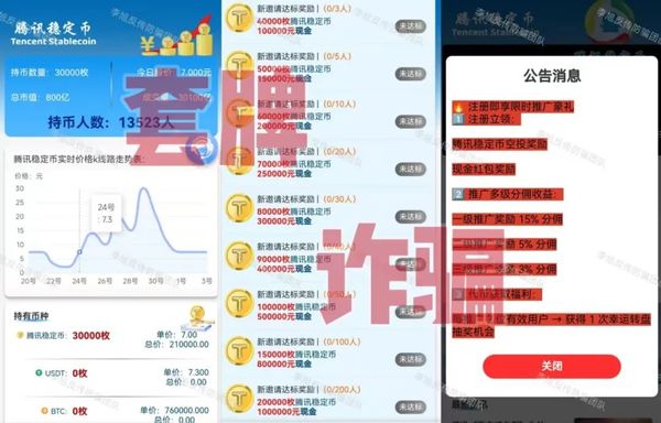 又一款蹭“穩(wěn)定幣“熱點(diǎn)推出的詐騙項(xiàng)目。冒用“騰訊”公司名義發(fā)布所謂的“騰訊穩(wěn)定幣”,通過傳銷模式大肆擴(kuò)張。此APP只能通過第三方二維碼、鏈接下載,下載提示未備案且攜帶病毒。