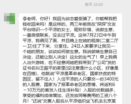 舒先生(化名)的經(jīng)歷更為曲折,他因情感關系而陷入騙局。兩三年前,他在交友平臺“探探”上結識了一位自稱“珍惜”的平?jīng)雠雨愲p弟(化名)。經(jīng)過長期微信聯(lián)系,舒先生于2025年7月23日前往平?jīng)雠c對方見面。次日,陳女帶他到了一位名叫王振平的“朋友”家中,介紹了一項所謂的“扶貧資助”政策。據(jù)稱,平?jīng)鲎鳛槔蠀^(qū),享有特殊扶持政策,外地人只需繳納3400元的“入股費”,便可獲得6至10萬元的“生活補貼”,入股越多回報越高,且每月可領等額“工資”長達8個月。對方還聲稱,入股后可赴北京參加“頒獎大會”。