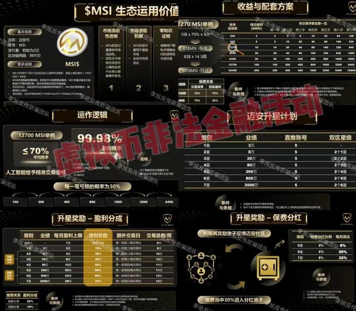 發(fā)行“MSI邁安幣”,用戶需投入資金購買“保障配套”,配套按投入金額分級,不同層級對應(yīng)不同日收益、交易手?jǐn)?shù)。設(shè)置“升星計劃”,根據(jù)累計業(yè)績、直推人數(shù)、團(tuán)隊內(nèi)下級“星級”等條件升級。星級越高分成也就越多。