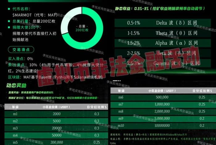 發(fā)行“MAT”虛擬代幣,借“腦波挖礦”噱頭進(jìn)行包裝。靜態(tài)設(shè)定0.5%-3%收益;動態(tài)設(shè)立“直推收益”“礦池分紅”激勵用戶發(fā)展下線。