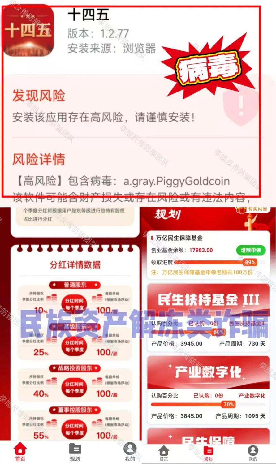 而這個上線不久的“十四五平臺”依然在使用各種“保障基金”“民生扶持”等話術(shù)吸引并誤導(dǎo)中老年人投資。APP依舊無法從正規(guī)渠道下載,下載后提示未備案且攜帶病毒。
