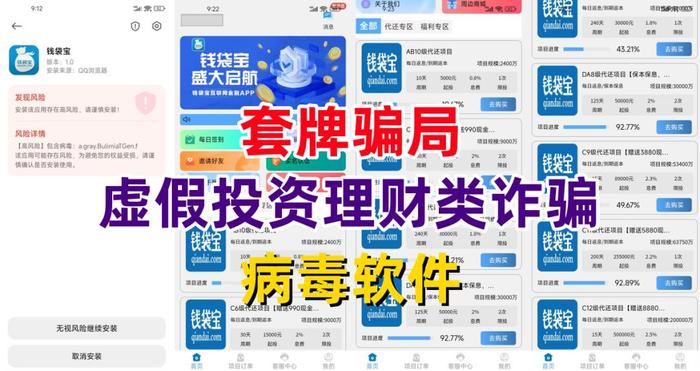 套牌虛假理財(cái)詐騙。不法分子冒充北京的一家公司,打著“代還”的旗號(hào),制作散布涉詐APP,虛構(gòu)推廣“AB10代還項(xiàng)目”“C6級(jí)代還項(xiàng)目”“AB13級(jí)代還項(xiàng)目”“DA8級(jí)代還項(xiàng)目”等日收益率高達(dá)0.8%-2%理財(cái)項(xiàng)目。