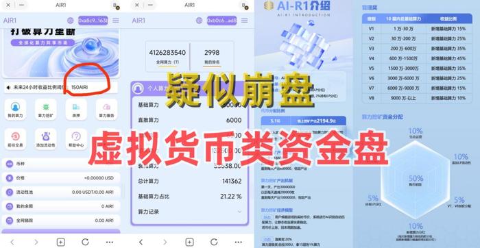 虛擬貨幣質(zhì)押詐騙。今年7月中旬,網(wǎng)友咨詢一個(gè)名為“AIR1”的虛擬貨幣理財(cái)項(xiàng)目,該項(xiàng)目宣稱AIR1是AIX平臺(tái)首個(gè)AI實(shí)體算力上鏈的項(xiàng)目,從0.0001增長(zhǎng)到了0.1107[煙花] 60天暴漲1107倍,咨詢是不是詐騙項(xiàng)目。根據(jù)資料分析該項(xiàng)目是虛擬貨幣類資金盤。