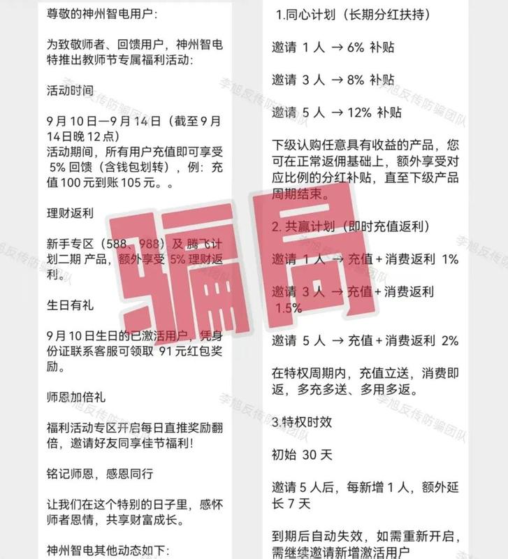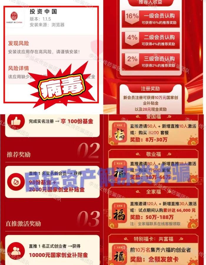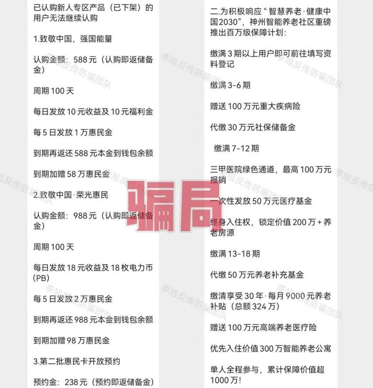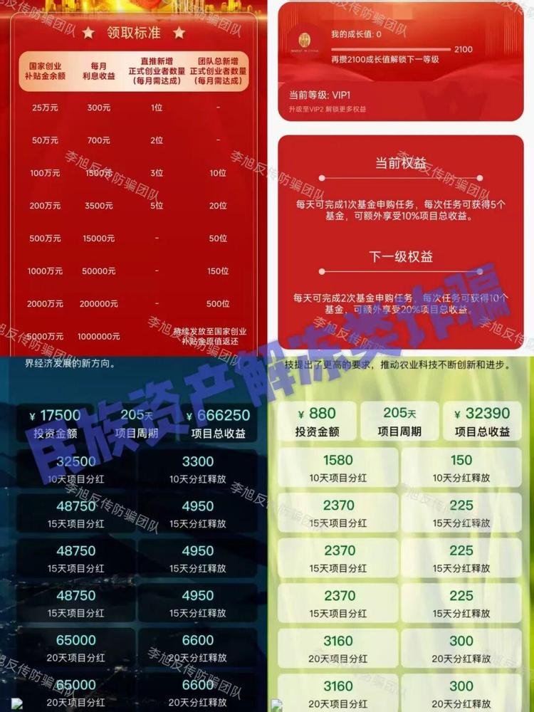 發(fā)表時間:2025-09-11 18:13作者:李旭反傳銷來源:李旭反傳防騙團隊 老話說得好:“天上不會掉餡餅,地上卻真有陷阱?!?/p> 這些年,各種騙術層出不窮,花樣翻新,有的是打著“國家項目”“高額回報”的旗號,有的是用“數(shù)字金融”“區(qū)塊鏈”這種新詞包裝,說白了,都是盯著咱們老百姓口袋里那點養(yǎng)老錢、辛苦錢。 他們摸準了很多人“圖省事、想快錢”的心理,編出一個個聽上去很美、實際根本站不住腳的故事。 有的APP連備案都沒有,安裝的時候手機都提醒有風險,可還是有人抱著“萬一是真的呢”的心態(tài)往里投錢。結果呢?錢拿不回來,信息還被盜用,甚至莫名其妙背上一身債。 一定要記住:任何未經(jīng)國家認證、沒有明確監(jiān)管、承諾“穩(wěn)賺不賠”“拉人獎勵”的項目,都要多問幾個為什么。 正經(jīng)的投資哪有那么高的回報?正規(guī)的國家補貼又哪需要你先交錢再領福利?騙局之所以能成,不是因為手段有多高明,而是因為有些人總愿意相信“這一次不一樣”。其實只要咱們穩(wěn)住心態(tài),不貪小、不輕信、多核實,再漂亮的騙局,也騙不到明白人。 民族資產(chǎn)解凍類詐騙 1、虛構的“神州智店”APP 偽造背書,假冒“國家電網(wǎng)”的虛假項目。 充值返5%、儲備金每日1%利息,折算成年化收益已經(jīng)遠超300%! 而正規(guī)理財年化普遍在3%-5%,這種“天上掉餡餅”的收益,根本不是靠智能電網(wǎng)等實體業(yè)務能夠賺來的,就是利用人們渴望“不勞而獲”的心理圈錢。 在最近推出的各種政策中,又是“養(yǎng)老計劃”又是“騰飛計劃”,看似很美好,實則沒任何監(jiān)管保障。 ![]() 況且,無論是保險還是社保都需國家認證資質,這些“高額回報”的承諾,目的就是讓參與者拉更多的人進來。 騙子甚至不用花一分錢,用后來人的投資款給前人發(fā)點甜頭,就完全能讓項目運轉起來,達到“收割”目的。 其實即使不分析這么多,這個APP在下載的時候就已經(jīng)提示未備案且攜帶病毒,足以證明它并未正規(guī)項目。 ![]() 2、虛構的“投資中國” 打著“國家創(chuàng)業(yè)補貼”的旗號吸引大眾,推出各種虛假投資理財項目。而這些項目都擁有投幾百就能賺幾十萬的超高回報率。正常投資怎么可能有如此離譜的回報? 而且,這個APP在安裝的時候,就已經(jīng)提示未備案且存在高風險,證明它連最基本的安全保障都沒有。 ![]() 用戶注冊之后,身份證、銀行卡等信息會被騙子利用,到時候很可能不光錢沒了,還會被人利用這些信息去貸款,甚至平白無故背上一身債務。 小編提示,正規(guī)的國家補貼、投資都是有嚴格規(guī)則的,從不會搞這種“投小錢賺大錢”“拉人就獎勵”的野路子。 遇到這種項目,還是躲得越遠越好! ![]() 3、冒牌的“稀土穩(wěn)定幣” 冒充“中國稀土集團”推出穩(wěn)定幣。不管是注冊還是拉人,甚至簽到都免費送。 ![]() 其實細想一下,要是這個幣真的這么值錢,還用得著“送”么?怕是搶都搶不到吧。 更值得注意的是,在結算中心界面中,號稱可以進行資產(chǎn)兌付和清算的項目,全部都是已經(jīng)被證實為民族資產(chǎn)解凍類詐騙的項目。足可見其“同流合污”。 ![]() 中國稀土集團在8月11日已經(jīng)發(fā)布聲明,明確表示這是一個虛假編造的騙局! 相關閱讀《有關穩(wěn)定幣!假的!螞蟻集團、中國稀土集團、京東發(fā)言人相繼發(fā)布打假聲明!》 4、虛構的“夕陽紅滿天”APP 項目方“打著身份核驗”的旗號,強制要求任何想要進入APP的新人必須先繳納一筆費用,人為制造“沉沒成本”,讓參與者為了回本,不得不繼續(xù)投資。 ![]() 如此明目張膽的斂財,就差直接把手伸進老百姓的口袋里了。 說是“國家扶貧”項目,但上線至今屢屢崩盤又多次重啟,這段時間又打著“黑客攻擊”的理由禁止提現(xiàn)。可悲的是竟然每次都能繼續(xù)騙到人。 更假的是,平臺充值收款賬號為不同的第三方個人或企業(yè),連APP鏈接地址都采用的動態(tài)IP,甚至都無法鎖定服務器位置。 據(jù)參與者介紹,還在“小黑屋踩縫紉機”的“張健”頻頻出現(xiàn)在該項目群聊中為參與者開會。而這位“張健”還同時出現(xiàn)在了多個民族資產(chǎn)解凍類項目當中。 其實,沒有一個是真的,視頻講話也均為AI數(shù)字人合成,全是冒充的! ![]() 5、虛構的“智能中國”APP 打著“打造數(shù)字中國、智能中國建設”的名義,虛構推廣“嶗山智慧康養(yǎng)數(shù)字津貼系統(tǒng)”“海淀融通智慧農(nóng)業(yè)基地”“上海一網(wǎng)統(tǒng)管AI增強工程”等高額返利理財項目。 ![]() 將“智能通”APP作為聊天軟件專門用來推廣項目。 設置了各種獎勵用來刺激參與者拉新,甚至連實名注冊的獎勵都十分豐厚。 看來無論是參與者的本金還是個人信息都是騙子的目標。 ![]() 6、虛構的“亞數(shù)行”APP 冒充“亞洲數(shù)字銀行”發(fā)行所謂的“亞數(shù)U卡”,宣稱內含30萬支付額度。只要推薦新人綁定支付軟件和銀行卡就可以得到。 而這些綁定操作無疑是將個人信息和支付權限完全交到了騙子手中。 那些通過拉人獲得的所謂的穩(wěn)定幣和支付金更是毫無價值的一串數(shù)字罷了。 ![]() 虛假投資理財 1、攢金 根據(jù)平臺宣傳,投資者充值可自動攢金,并根據(jù)充值金額或邀約人數(shù)晉升級別,級別越高,獲得