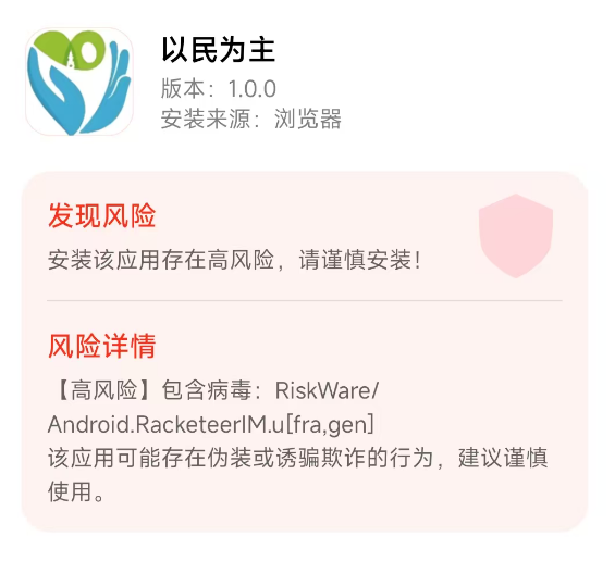 該應用下載的時候,提示病毒軟件,可能存在偽裝或誘騙詐騙的行為。