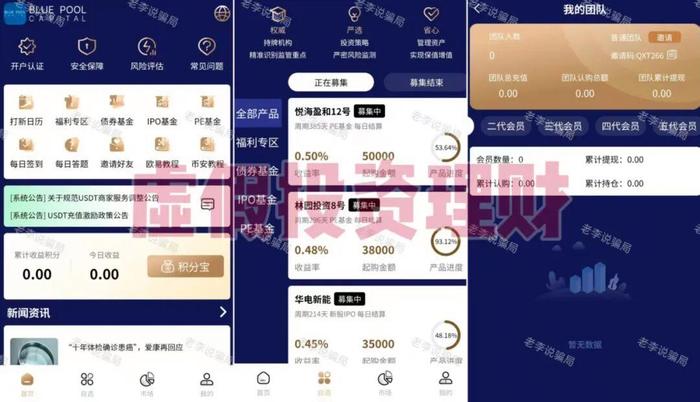 假冒“藍(lán)某資本”,虛構(gòu)推廣高額返利理財(cái)項(xiàng)目,依靠多層級(jí)會(huì)員制度進(jìn)行返利。收益高度依賴新人入金維持,屬典型龐氏騙局。