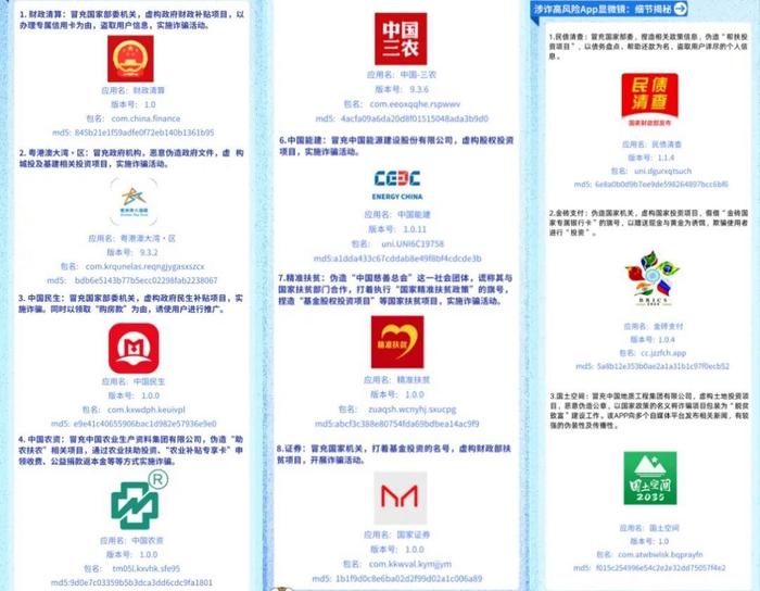 除此之外,今年比較活躍的還有假冒的“國(guó)能”涉詐APP,假冒的“中國(guó)政企”涉詐APP,假冒的“慈聯(lián)”涉詐APP,假冒的“人民資產(chǎn)”涉詐APP、假冒的“中國(guó)三農(nóng)”涉詐APP 等,這些相關(guān)聯(lián)企業(yè)都紛紛發(fā)布辟謠聲明!