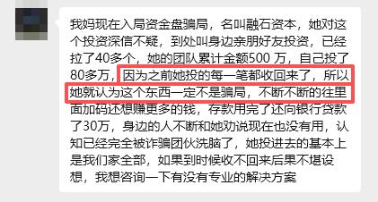 9月中旬,一位“融石”虛假投資理財(cái)平臺(tái)的參與者家屬跟我們聯(lián)系,她母親因?yàn)橹巴兜拿恳还P錢(qián)都收回來(lái)了,所以認(rèn)為不是騙局,不斷往里加碼。9月末,項(xiàng)目徹底跑路,她母親把全部家當(dāng)也都賠了進(jìn)去。