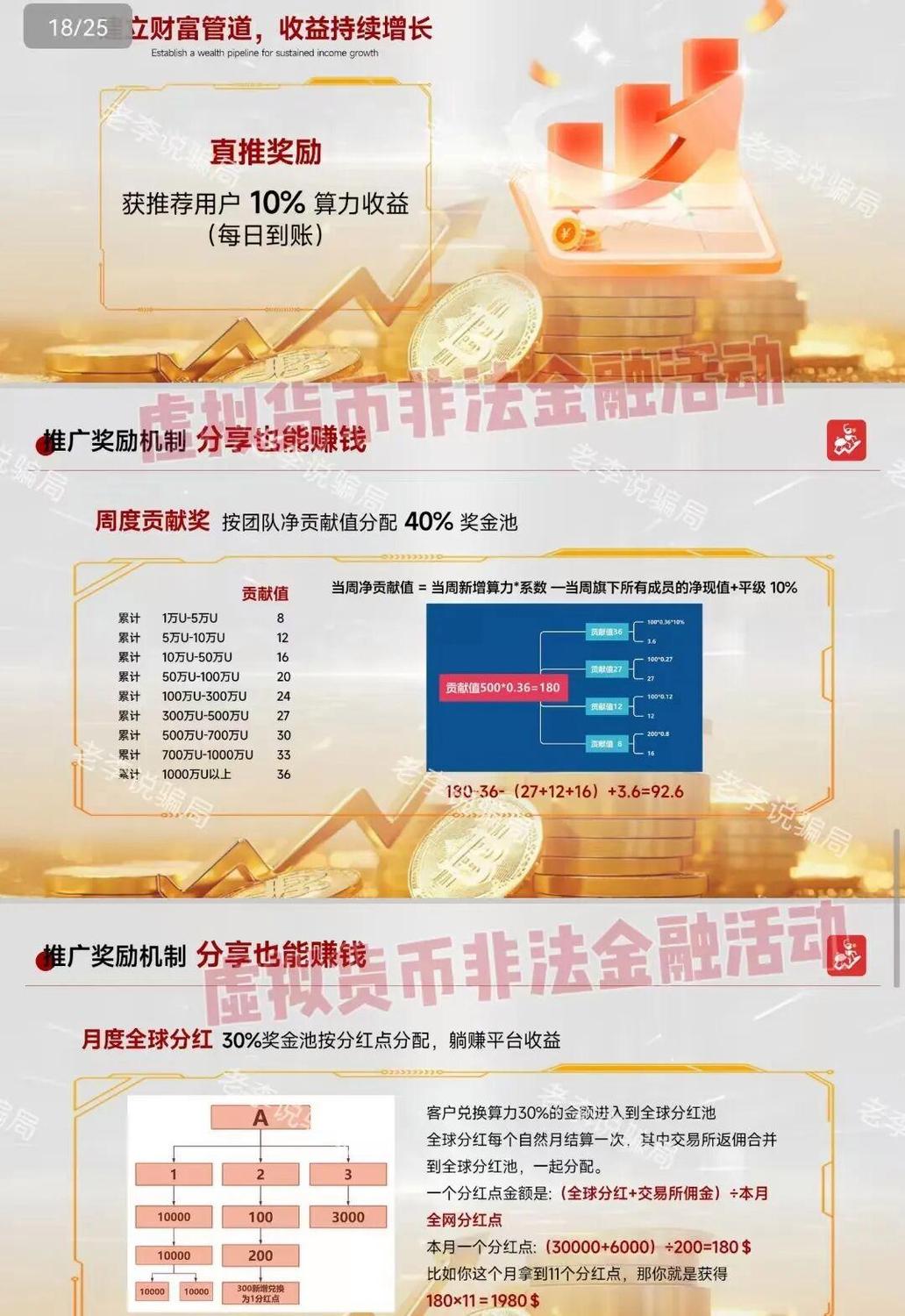 發(fā)表時(shí)間:2025-11-06 20:08作者:李旭反傳銷來源:李旭反傳防騙團(tuán)隊(duì) 如果你手機(jī)里投資的某個(gè)平臺,最近突然要求繳納各種提現(xiàn)、解凍手續(xù)費(fèi),或者APP時(shí)好時(shí)壞,甚至官方已經(jīng)明確發(fā)布“打假聲明”,千萬要高度警惕! 這可不是什么“系統(tǒng)升級”或者“勝利在望”,這是騙局快要收網(wǎng)跑路的明確信號! 作為在反傳防騙領(lǐng)域深耕進(jìn)20年的團(tuán)隊(duì),我們見過太多案例,大多數(shù)騙局直到最后關(guān)頭,還會利用“不甘心”刺激參與者,讓人明知被騙卻還總想著再次投錢翻本。 今天這篇文章提到的項(xiàng)目,很多已經(jīng)亮起紅燈,大家趕緊對照,千萬別讓自己辛苦攢下的血汗錢打了水漂! 永遠(yuǎn)記住,及時(shí)止損才是上岸第一步! 1、虛構(gòu)的“人民資產(chǎn)”APP 這個(gè)項(xiàng)目最近開啟了新一輪收割。謊稱即將提現(xiàn)要求參與者繳納1500元用于解鎖通道,否則將無法提現(xiàn)。為了增加緊迫感,群內(nèi)不斷有人慫恿,營造不交錢就會“功虧一簣”的假象,致使參與者在短時(shí)間內(nèi)失去理性和判斷能力,在“不甘心”的驅(qū)動下繼續(xù)投入。而這,很可能是平臺跑路前的最后一筆收割。 小編只想說,沉沒成本不可追,及時(shí)止損才是上岸第一步。 ![]() 2、紅蟻AI 號稱AI量化炒作虛擬資產(chǎn),通過兌換算力參與平臺結(jié)算,宣稱40%~80%年化收益,遠(yuǎn)遠(yuǎn)超出市場合理水平。其設(shè)置的直推返利、團(tuán)隊(duì)貢獻(xiàn)獎、全球分紅等多層級推廣獎勵機(jī)制,明顯為了吸納新人入金填補(bǔ)舊人收益,帶有典型龐氏騙局色彩。 根據(jù)我國相關(guān)規(guī)定,虛擬貨幣代幣發(fā)行融資和交易炒作相關(guān)交易均不受法律保護(hù),屬非法金融活動。資金流向缺乏監(jiān)管,不僅存在平臺突然跑路的巨大風(fēng)險(xiǎn),所謂“智能交易、穩(wěn)健盈利”的承諾也根本無法兌現(xiàn),一旦參與,投資者很可能面臨血本無歸的結(jié)局,后續(xù)維權(quán)難度極大。 ![]() 3、套牌的“海洋牧場”APP 8月18日,被套牌的“山東海洋集團(tuán)”發(fā)布聲明,證實(shí)有人冒用其單位名義宣揚(yáng)“海洋牧場”等融資行為,系詐騙。望大家謹(jǐn)慎甄別。 ![]() 4、“GEC環(huán)保幣2.0”傳銷幣 打著“環(huán)保幣”名義推出了2.0版本。宣稱參與者實(shí)名注冊后,可租賃礦機(jī)挖礦,發(fā)展下線還可獲得動態(tài)獎勵。 有參與者反饋,自己陸續(xù)購買8臺小礦機(jī),4臺2級礦機(jī),共500多枚環(huán)保幣。但在想要賣出變現(xiàn)的時(shí)候,賬號被永久封號,損失慘重。 2019年,浙江省民政廳已經(jīng)將發(fā)行方“世界環(huán)保創(chuàng)業(yè)基金會”定性為非法組織。 ![]() 5、虛構(gòu)的“審計(jì)通 APP” 謊稱國家項(xiàng)目,承諾高額回報(bào)吸引參與者實(shí)名注冊,隨后忽悠參與者繳納所謂的“提現(xiàn)手續(xù)費(fèi)”騙取資金。APP下載提示未備案且攜帶病毒。 6、Des Alpes 阿爾卑斯 核心產(chǎn)品為一款加密貨幣,要求用戶繳納129美元獲得參與資格,通過“1-20層強(qiáng)制矩陣”和推薦關(guān)系形成金字塔層級,收益主要來自拉新,根據(jù)推薦人數(shù)發(fā)放見點(diǎn)獎。 該項(xiàng)目利用虛擬幣交易,資金不受法律保護(hù),存在洗錢風(fēng)險(xiǎn);承諾保本高收益,風(fēng)險(xiǎn)極高。 ![]() 7、MICRO 微易 會員購買梯度配套,宣稱可通過 “AI 交易系統(tǒng)” 獲靜態(tài)收益,設(shè)置多級代理體系,以發(fā)展人員數(shù)量和投資金額計(jì)酬。 同時(shí)平臺違規(guī)發(fā)行“MEC”代幣,宣稱可用于抵扣手續(xù)費(fèi)、質(zhì)押收益、鏈游支付等,號稱通過“挖礦+銷毀”機(jī)制制造稀缺性,虛構(gòu)升值前景,誘導(dǎo)用戶投資。 ![]() 8、Sollong(索隆) 10月開始,這個(gè)項(xiàng)目就一直在大面積單割團(tuán)隊(duì),致使眾多參與者無法提現(xiàn)。近日,該項(xiàng)目徹底無法打開,群聊全部解散,關(guān)網(wǎng)跑路。 ![]() 9、虛構(gòu)的“人民化債”APP 目前APP已經(jīng)無法打開,疑似跑路。 10、套牌的“京東科技”APP 冒充“京東”,以“為參與者退款”為誘餌吸引大眾。近日群聊突然解散,疑似崩盤。 11、秦皇島中綠平債傳銷 打著“中綠公司”“平債”“國家項(xiàng)目”等旗號,聲稱參與其中可以平掉債務(wù)、消除違法記錄,使用各種“障眼法”偽造相關(guān)記錄,利用人們信息不對等、專業(yè)知識匱乏的特點(diǎn)博取信任,引誘參與者投資2900元-43500元,鼓吹出局可以獲得1.5億元的回報(bào)。 相關(guān)閱讀《參與“秦皇島中綠平債”一年后,他們都怎么樣了?》 12、廣西北海70000傳銷 網(wǎng)友在微信群內(nèi)添加某陌生人為好友,對方以“承包工程”為由邀請網(wǎng)友前往北??疾欤S后打著辦理通行證的幌子將網(wǎng)友留下,并開始帶其前往各個(gè)傳銷窩點(diǎn)聽課“洗腦”。向其灌輸投資7萬元認(rèn)購21份,出局可賺千萬元的高額回報(bào)。同時(shí)打著“北部灣開發(fā)”“資本運(yùn)作”“國家項(xiàng)目”等旗號,利用各種非法出版物為其講解“行業(yè)制度”。 網(wǎng)友頓時(shí)明白自己陷入傳銷。當(dāng)再次查看初來北海時(shí)簽訂的那份看似正規(guī)的“保密協(xié)議”,竟然也是漏洞百出。 ![]() 據(jù)