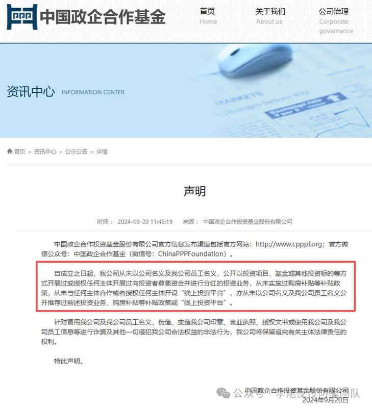 然而,早在2024年9月,中國政企合作投資基金股份有限公司就在其官方網(wǎng)站發(fā)出《聲明》,明確表示從未開設(shè)線上投資平臺。