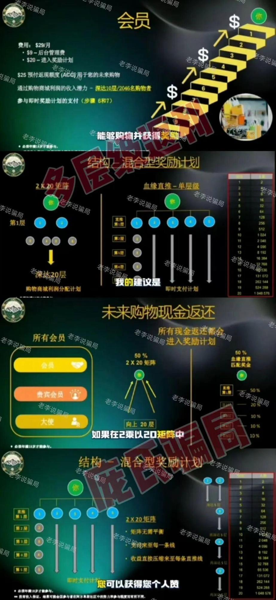 打著跨境電商旗號,實質核心為一款加密貨幣。要求用戶繳納129美元獲得參與資格,通過“1-20層強制矩陣”和推薦關系形成金字塔層級,根據推薦人數發(fā)放見點獎。收益完全依賴新人入金,屬典型龐氏騙局。