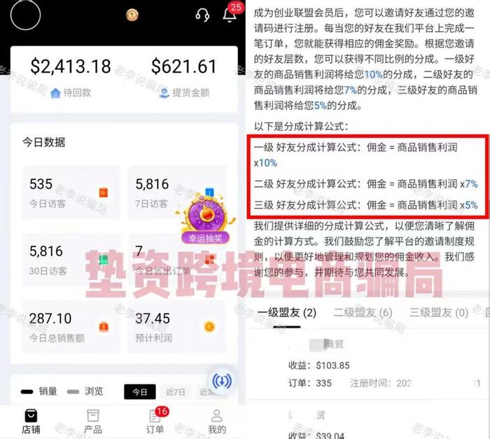 打著跨境電商旗號要求用戶兌換美金墊資下單,號稱由公司一件代發(fā),7天后回款。推薦好友享三級分傭。