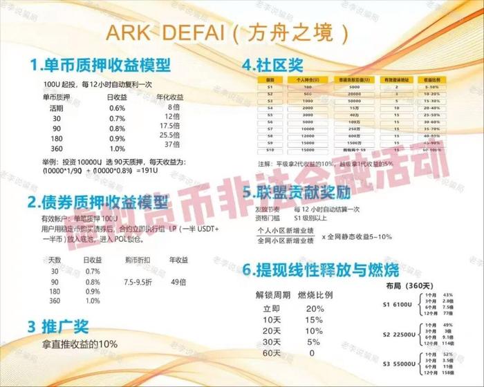 以超高年化收益為誘餌,宣稱單幣質(zhì)押最高可得37倍,債券質(zhì)押49倍等等,搭配多層級(jí)拉新獎(jiǎng)勵(lì),無實(shí)際業(yè)務(wù)支撐,收益完全依賴后續(xù)參與者的資金注入。資金鏈極易斷裂,最終參與者會(huì)血本無歸。