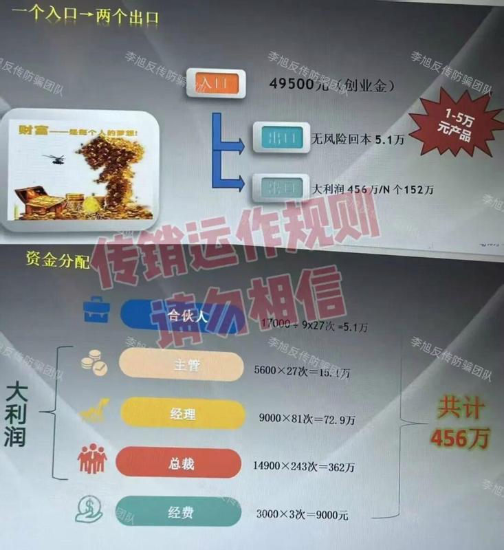 發(fā)表時(shí)間:2025-11-13 19:01作者:李旭反傳銷來源:李旭反傳防騙團(tuán)隊(duì) “資源共享、重復(fù)利用、多次變現(xiàn),低投入撬動456萬高回報(bào)”——這樣的宣傳語,讓渴望創(chuàng)業(yè)增收的金女士動了心。 然而,投入49500元、拉來2名親友后,她才發(fā)現(xiàn)這場號稱“新興經(jīng)濟(jì)形態(tài)”的項(xiàng)目,實(shí)則是一場精心包裝的傳銷騙局。從德州齊河、臨沂的四五星級酒店會場,到“公平透明”的資金分配機(jī)制,騙局的每一環(huán)都暗藏陷阱,直到本金遲遲無法收回,她才幡然醒悟,想要退款卻遭對方強(qiáng)硬拒絕,甚至被揚(yáng)言“報(bào)警、舉報(bào)都沒用”。 ![]() 一、騙局親歷:從“考察生意”到深陷泥潭 2024年10月,金女士被朋友以“考察一個(gè)好生意”為由,邀請參加一場在五星級酒店舉辦的“跨界融合共享平臺”宣講會。對方承諾“只勸看不勸干,合適再做”,加上會場選址高端、參與人數(shù)眾多(每場300-400人),讓她放下了最初的警惕。此后,她又先后3次參加了在德州齊河阿爾卡迪亞溫泉高爾夫國際酒店、臨沂臨沭縣城發(fā)常林藍(lán)海酒店等多地舉辦的宣講會,逐步陷入了騙局的圈套。 宣講會的流程被設(shè)計(jì)得極具迷惑性,全程為期3天,環(huán)環(huán)相扣引導(dǎo)參與者投資: 第一天晚上6點(diǎn)半才正式開課,先通過“跨界融合共享平臺”的課件展示,拋出“資源共享、多次變現(xiàn)”的概念,再播放財(cái)經(jīng)二頻道相關(guān)視頻,曲解“法無禁止皆可為”,為項(xiàng)目貼上“合法合規(guī)”的標(biāo)簽; 第二天的課程密度最大,4位講師輪番上陣講授6節(jié)課:上午講解“滿崗搶滿崗”的實(shí)現(xiàn)方式,展示所謂“成功人士”的豪宅豪車照片,營造“低投入高回報(bào)”的造富假象;下午兩位講師用90分鐘解讀“出局不出圈”規(guī)則,最后兩節(jié)課專門混淆直銷、傳銷與資金盤的區(qū)別,洗白項(xiàng)目性質(zhì);當(dāng)晚還會將新人與老人分會議室培訓(xùn),新人需參加考試,考試后再次詳解盈利模式,明確“拉人頭”對應(yīng)的收益回報(bào); 第三天早餐后,組織者會重復(fù)講解模式圖,讓未通過考試的人補(bǔ)考,并強(qiáng)調(diào)“考試不通過不能參與”,隨后便進(jìn)入核心的“促單環(huán)節(jié)”,要求參與者繳納49500元“創(chuàng)業(yè)金”,拿不出全款的則被誘導(dǎo)先交定金。 整個(gè)會場管控嚴(yán)格,有多人巡場,嚴(yán)禁參與者用手機(jī)拍照錄像,一旦發(fā)現(xiàn)便要求立即刪除,這也為后續(xù)受害者維權(quán)取證增加了難度。被會場氛圍感染,又輕信了“無風(fēng)險(xiǎn)回本5.1萬+附贈1-5萬元產(chǎn)品”的承諾,金女士最終繳納了49500元,還按照項(xiàng)目要求拉了2名親友加入。然而,直到2025年9月,她的本金仍未收回,當(dāng)她要求退款時(shí),對方卻態(tài)度強(qiáng)硬,聲稱這是“個(gè)人糾紛”,拒絕退還任何費(fèi)用。 據(jù)金女士了解,該傳銷組織主要在德州齊河、臨沂、棗莊等地輪換舉辦會場,參與者大多來自菏澤地區(qū),還有部分來自泰安和河南濟(jì)源,僅2025年9月就安排了兩期宣講會(1-3號、7-9號),持續(xù)擴(kuò)大騙局影響范圍。 二、騙局模式:精心包裝的“拉人頭”資金游戲 該傳銷組織對外宣稱“跨界融合共享平臺”,整合了實(shí)體經(jīng)濟(jì)、虛擬經(jīng)濟(jì)、分享經(jīng)濟(jì)等多種概念,核心運(yùn)作模式卻完全依賴“拉人頭”發(fā)展下線,用新參與者的資金向舊參與者支付“收益”,本質(zhì)是典型的龐氏騙局,其具體運(yùn)作邏輯如下: (一)投資與收益規(guī)則 參與者需一次性繳納49500元“創(chuàng)業(yè)金”,無額外追加投資,號稱“終生一次投資,長期收益”。 組織方承諾兩大收益出口:一是“無風(fēng)險(xiǎn)回本5.1萬”,附贈1-5萬元產(chǎn)品;二“大利潤收益”,最高可獲456萬或多個(gè)152萬,收益上限取決于“個(gè)人資源與運(yùn)作能力”。 ![]() (二)資金分配機(jī)制 49500元“創(chuàng)業(yè)金”的分配被拆分為多個(gè)部分:推薦人獲得3000元運(yùn)作經(jīng)費(fèi),9位合伙人每人分得1888.88元(合計(jì)17000元),主管分得5600元,經(jīng)理分得9000元,總裁分得14900元,號稱“100%資金分配、零沉淀”。組織方還給出了看似誘人的總收益構(gòu)成:5.1萬本金回本+15.1萬主管崗位工資+72.9萬經(jīng)理崗位工資+362萬總裁崗位工資+9000元合作商經(jīng)費(fèi)=456萬“滿崗部門總收益”。 ![]() (三)團(tuán)隊(duì)運(yùn)作與倍增邏輯 以“主管+3位組長+9位合伙人”的13人團(tuán)隊(duì)為基礎(chǔ),需開發(fā)27位新的“創(chuàng)業(yè)期合作商”才算“滿崗”。滿崗后團(tuán)隊(duì)將拆分為3個(gè)新團(tuán)隊(duì),原組長升為主管,原合伙人升為組長,原合作商升為合伙人,新團(tuán)隊(duì)再重復(fù)“開發(fā)27位合作商”的流程,實(shí)現(xiàn)規(guī)模擴(kuò)張。組織方將此稱為“團(tuán)隊(duì)抱團(tuán)倍增”,聲稱區(qū)別于傳統(tǒng)個(gè)人倍增模式,無需單打獨(dú)斗。 (四)講師包裝與宣傳話術(shù) 宣講會的核心講師均被賦予“勵(lì)志創(chuàng)業(yè)故事”,如核心講師趙春麗,號稱擁有14年服裝連鎖店經(jīng)營經(jīng)驗(yàn),涉足多家直銷品牌并達(dá)最高級別,后因傳統(tǒng)生意資金鏈斷裂轉(zhuǎn)型,最終通過該平
