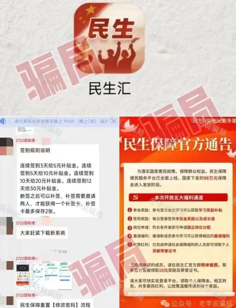 冒充國家部門,以領(lǐng)取98萬民生保障金吸引參與者實名注冊,非法套取用戶個人信息。每日以小額紅包為誘餌,要求參與者簽到聽課學(xué)習(xí)。參與者很可能因信息泄露面臨“洗錢”風(fēng)險。
