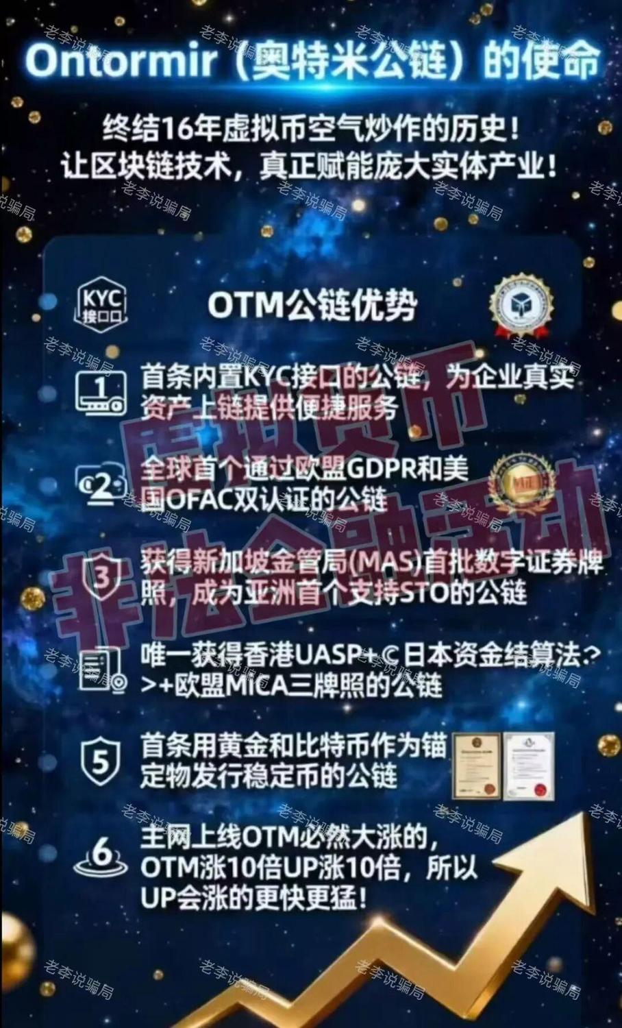打著RWA、公鏈旗號,依靠“漲10倍”等高收益為參與者“畫餅”。號稱擁有歐盟MICA、香港UASP+等頂級合規(guī)牌照,實則根本無法核實真?zhèn)?。宣稱的200噸黃金、2萬臺礦機(jī)等底層資產(chǎn)更是無任何驗證依據(jù),12000TPS的技術(shù)參數(shù)遠(yuǎn)超行業(yè)常識且無數(shù)據(jù)支撐。這本質(zhì)是借熱門概念炒作出的資金盤,后續(xù)跑路、崩盤風(fēng)險極大,建議大家別碰。