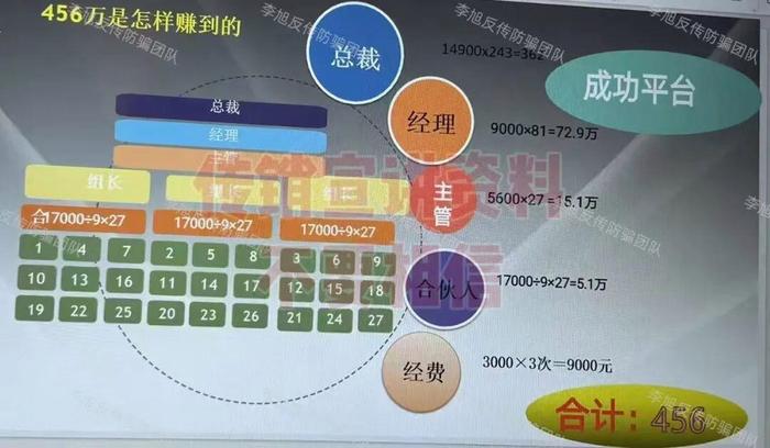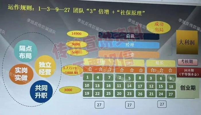 講課時詳細拆解了“總裁、經(jīng)理、主管、組長、合伙人”五級架構(gòu),制定“隔點布局、實崗實做、獨立經(jīng)營、共同升值”16字方針,規(guī)定27人為一個晉升單位,每位新成員繳納的49500元,按“9位合伙人各1888.88元、主管5600元、經(jīng)理9000元、總裁14900元、運作經(jīng)費3000元”的比例分配。還推出“團隊倍增”“搶崗機制”“出局不出圈”等復雜規(guī)則,宣稱“抱團發(fā)展,無需單打獨斗”“江山輪流坐,晚來者也有機會”。