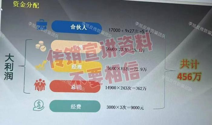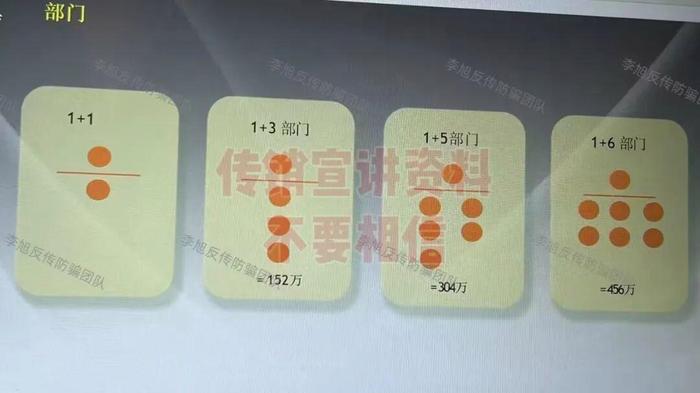 講課中反復強調(diào)四大“核心優(yōu)勢”:投資49500元可無條件拿回5.1萬,還贈1-5萬產(chǎn)品;有“傳幫帶”體系,有人教有人幫;以小博大實現(xiàn)財富倍增;資金24小時內(nèi)100%分配,無沉淀無跑路風險。同時明確列出利潤梯度:拉3人出局賺152萬,拉5人賺304萬,拉6人賺456萬。